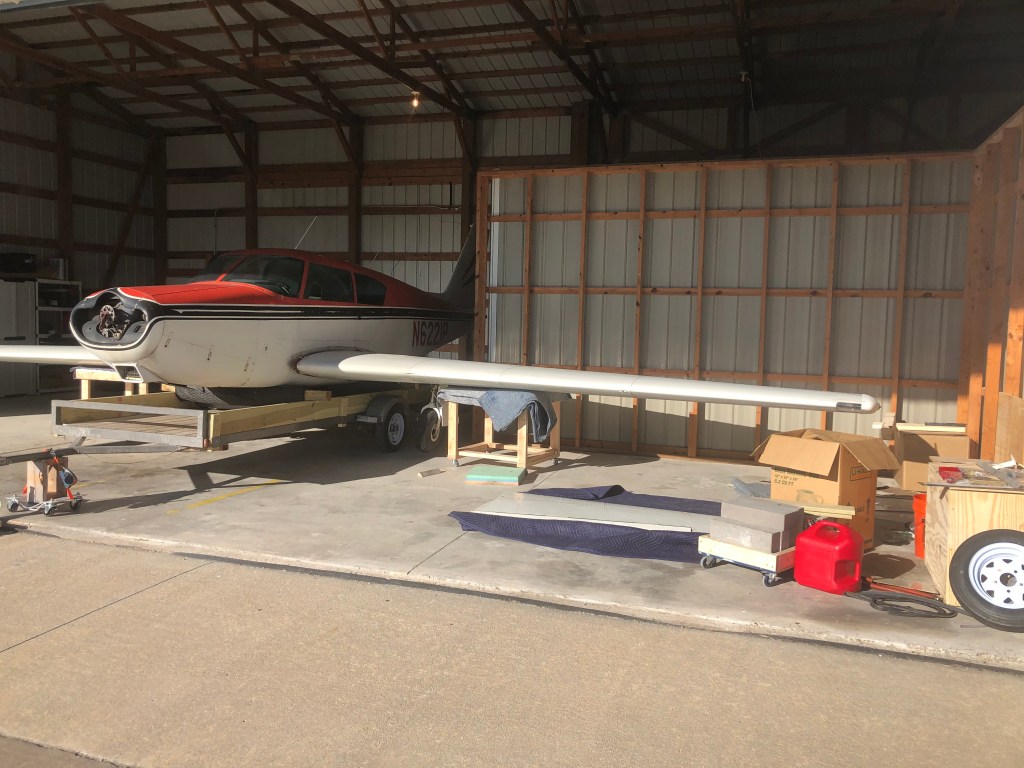 Now that the warm weather has returned, we have spent nearly every spare minute putting N6221P back together following its ground transportation excursion. I built two adjustable “wing tables” to position the wings and set the dihedral. This is critical as the wings must be inserted into the fuselage and bolted together while also maintaining the correct angle. After two modifications to the wing tables, which initially weren’t tall enough, we were eventually able to master this procedure. I learned there are two fittings that can only be installed as you slide the wings into the fuselage. By the third time it was easy to get the wings into place and together correctly. Overall, I’ve found the wing install is at least two times more difficult on a PA24 than a PA28, and five times more difficult than a high wing Piper.