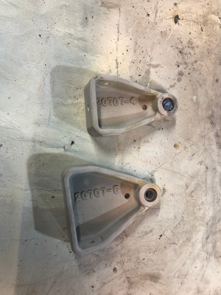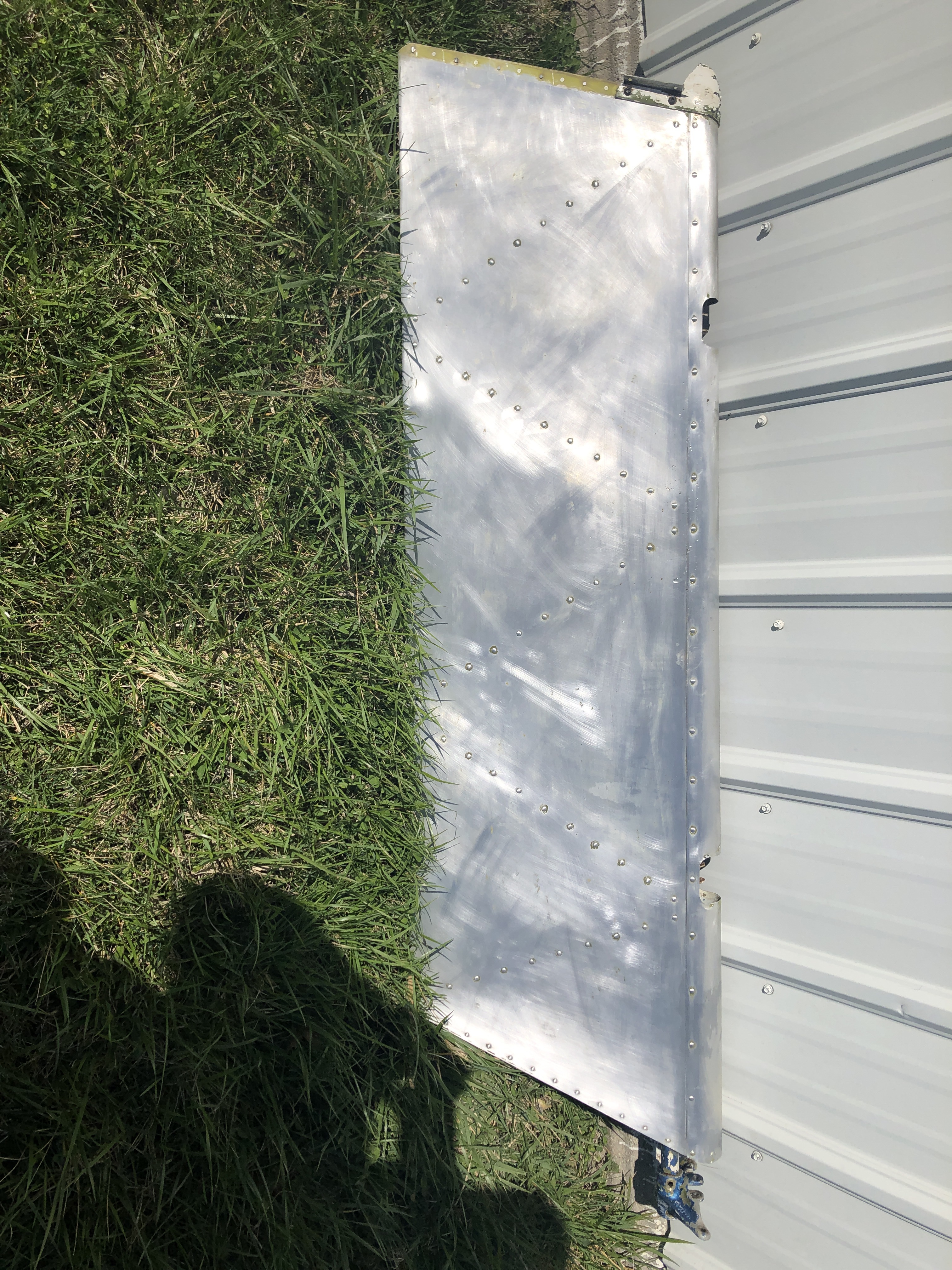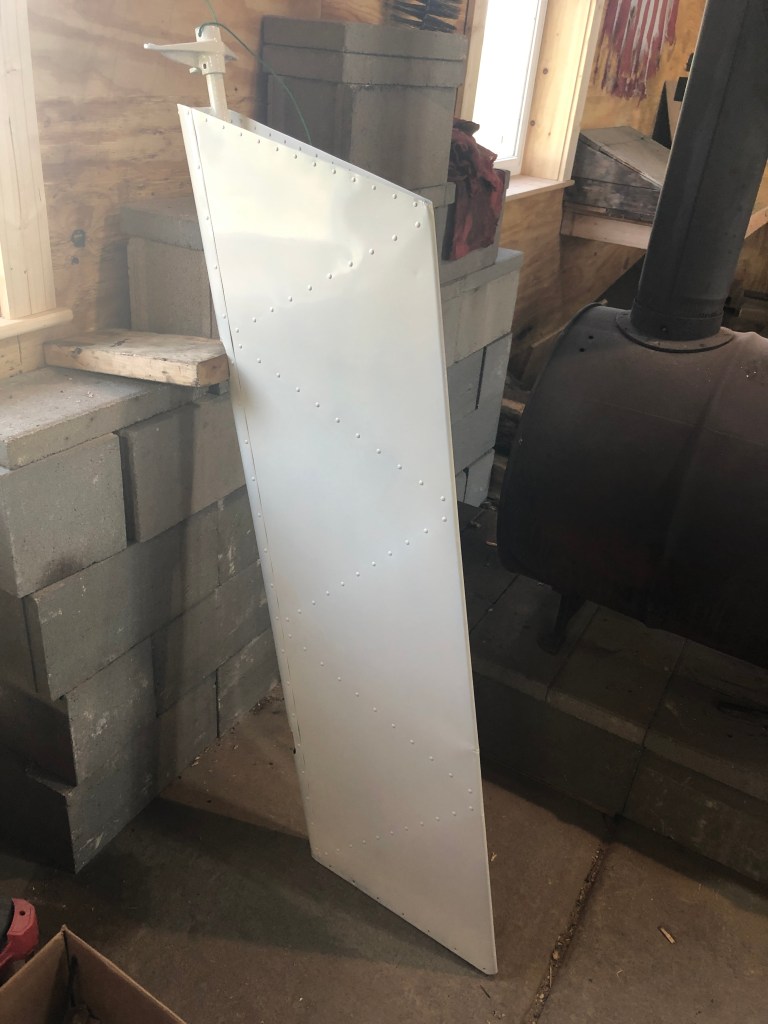 Here are a few pictures of the rudder hinge brackets and counter weight assembly. I glass bead blasted everything taking care not to damage or contaminate the the bearing surfaces. Everything was re-assembled with new AN hardware to include the hinge bolts thereby complying with the 500 hour replacement requirement. Below is the rudder with a fresh coat of PTI Juneau White Enamel. The final step was to check the balance of the rudder IAW the service manual – unfortunately I did not get a picture of that step. I often find it difficult to slow down and take pictures of the key steps.