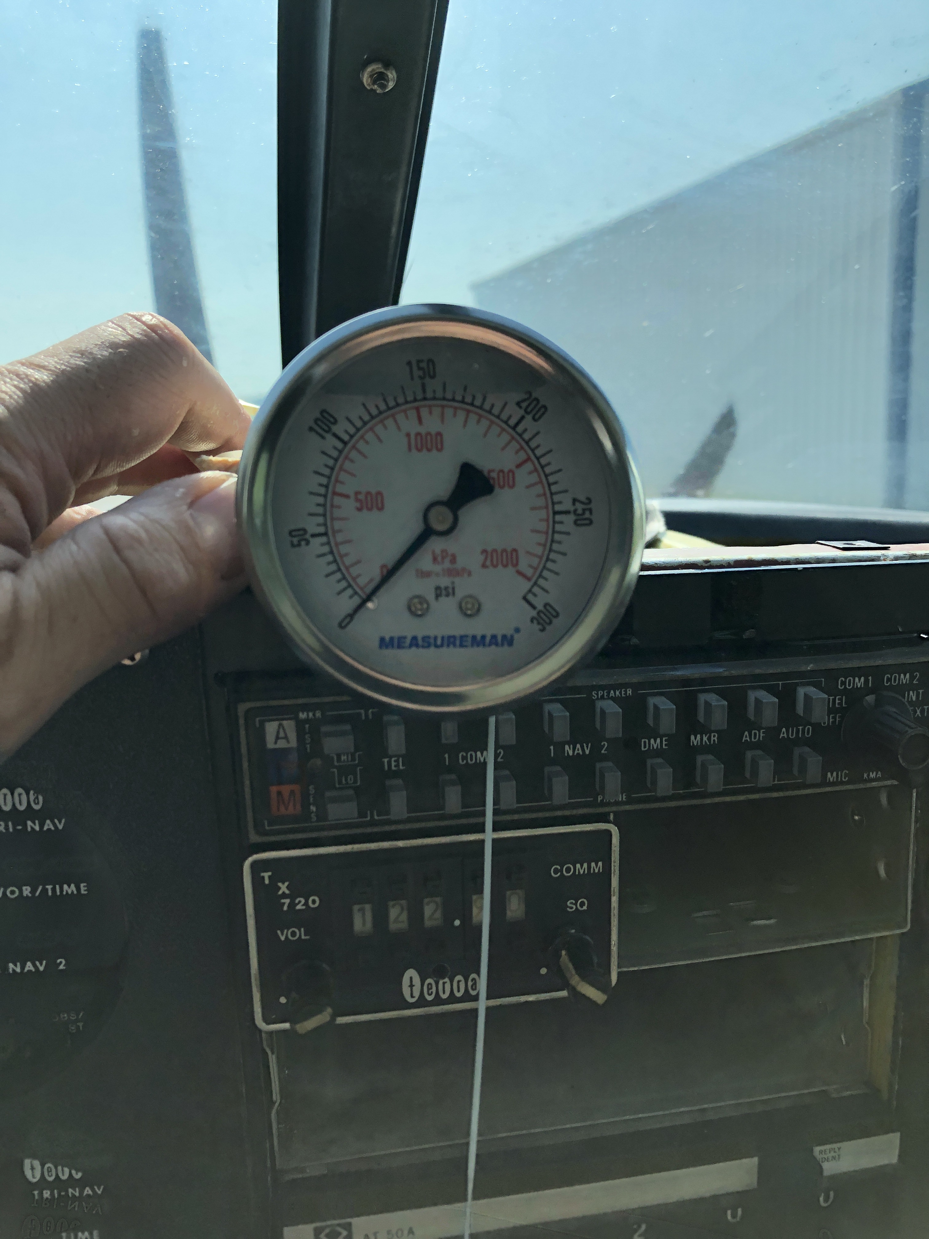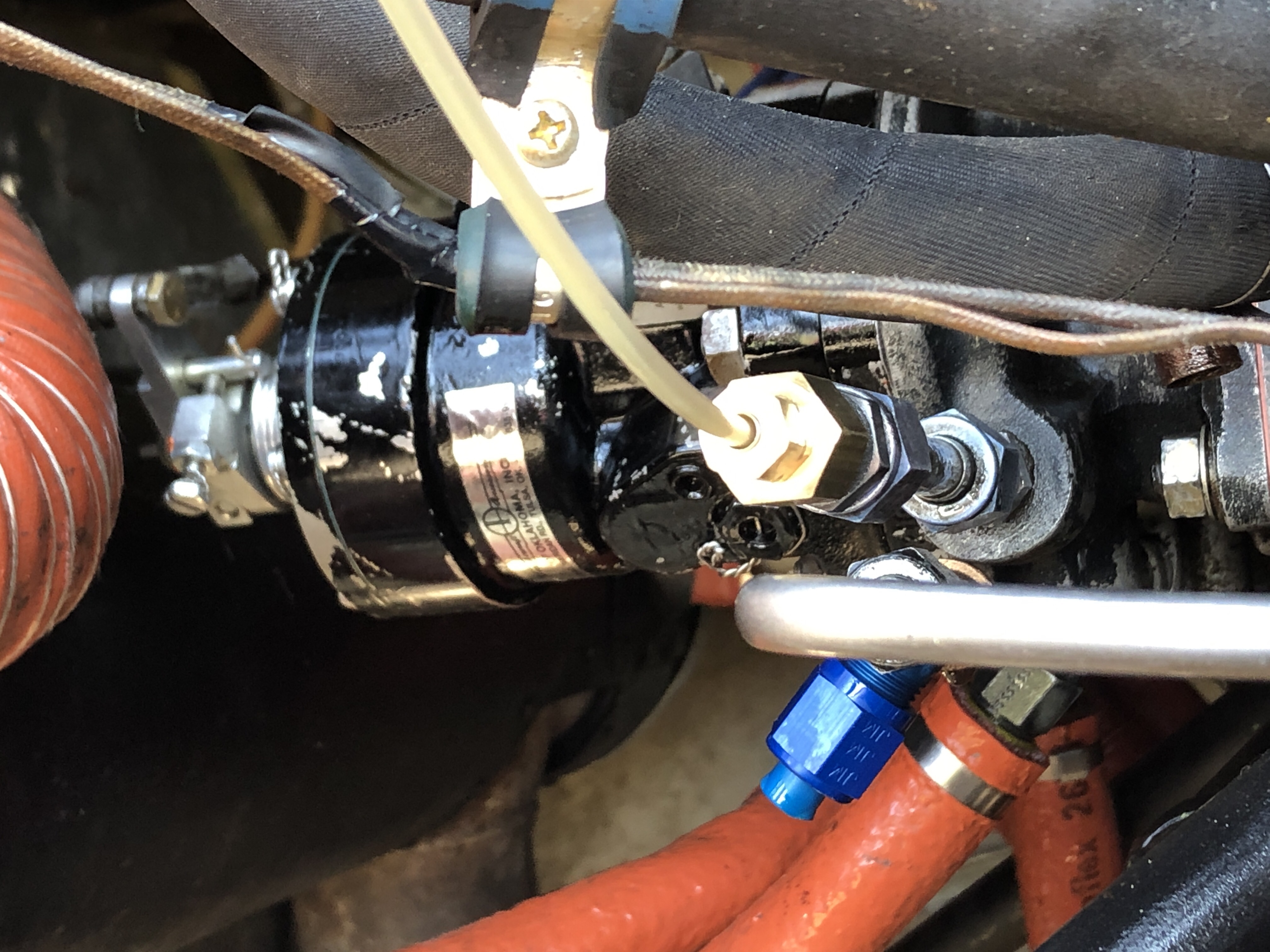 More often than not, a lack of pitch control is caused by a lack of oil control to the prop. The Hartzell HC-92ZK-8D propeller is controlled by increasing oil pressure to the prop thereby increasing the blade angle. This means the propeller governor must take the engine oil supply and increase its pressure to around 275 PSI to operate the pitch change mechanism. Our Woodward 210185 propeller governor had just been overhauled, but after discovering we had no prop pitch we sent it back for another bench test, which it passed with no issue. Aircraft Accessories of Oklahoma was very helpful with the bench test and also provided me with the technical data to do an on aircraft test of the oil pressure output of the governor. While the governor was being bench checked I performed Lycoming SI-1462A Prop Oil Control Leak Test. This test involves installing a ported plate in place of the governor and checking first the engine oil pressure to the governor then applying compressed air to the prop oil control circuit through a differential pressure tester (engine compression guage) and checking for correct pressure. Both of these tests were with-in Lycoming’s specifications. When the governor arrived back from Oklahoma I installed it and did an on aircraft pressure test. There is no approved procedure for this but I fabricated a test set and did a ground run to check the discharge pressure of the governor. It was right on specification in the Woodward Overhaul manual. Pictures of my test set below.