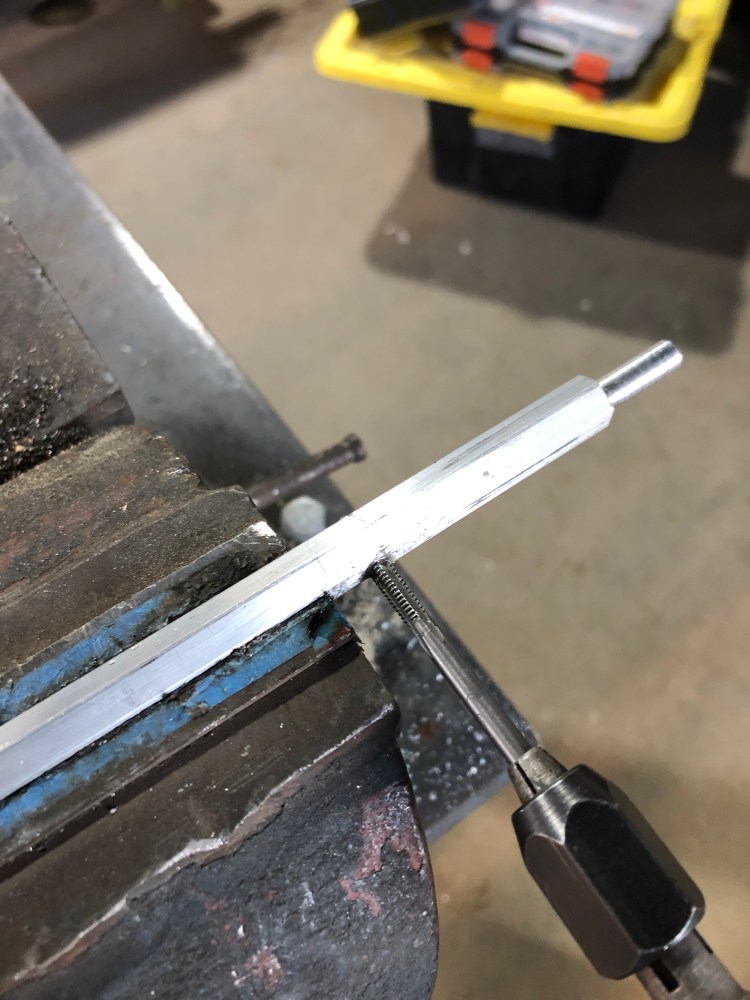 After the shafts are cut to legnth and machined its time to drill and tap four mounting holes to secure the plastic visor to the shaft. The 8-32 screws require and 8-32 tap which can be a challenge to get through the hex bar with out breaking the tap. Go slow and use aluminum cutting fluid!!
